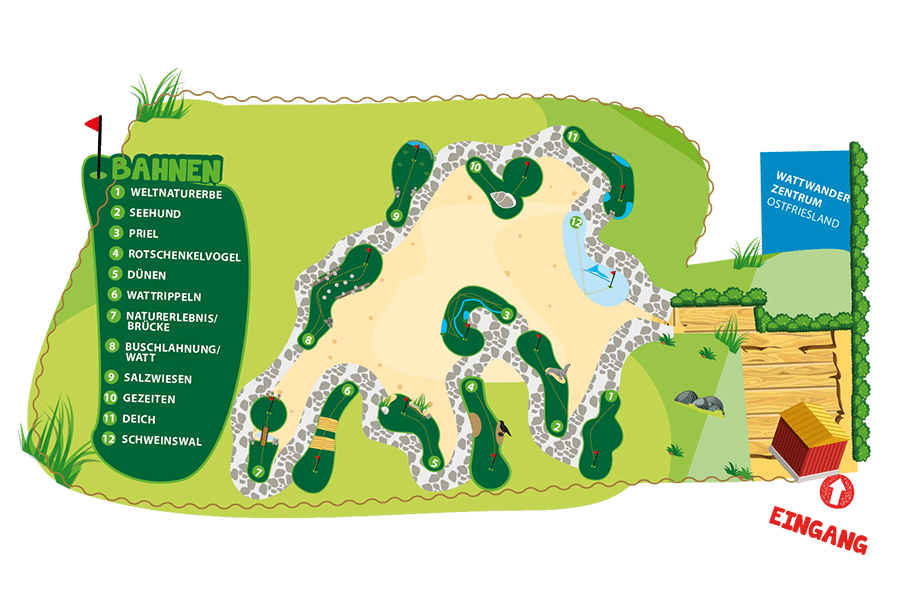 Die Anlage liegt direkt an der Strandkasse und dem neuen Wattwanderzentrum am Eingang zum Strand in Harlesiel. Auf zwölf spannenden Bahnen, die mit ihrer fantasievollen Ausstattung unsere einzigartige Lage am Wattenmeer widerspiegeln, erleben Sie den neuen Freizeitspaß. Die Kunstrasenbahnen, kombiniert mit natürlichen Hindernissen wie Schrägen, Hügeln und Wasserläufen, bilden die natürliche Umgebung vor und hinter dem Deich mit Dünen, Prielen, Muscheln und Seehunden ab. Zusätzlich gibt es Infos zur Region, passend zum Nationalpark Wattenmeer.